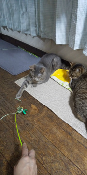 じゃらしを降ると、何処からでもすぐに飛んできます(笑) たくさん遊ぶし何でも食べる、健康体の若い美猫で、飼いやすい子です☆