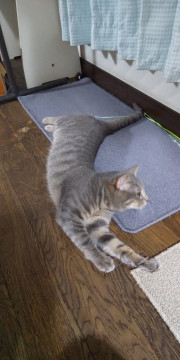 長毛ではありませんが、ふわふわな毛並みがぬいぐるみみたいで、背中はグレー単色、手足としっぽ、身体の横がシマシマになってて、とっても綺麗な美猫君です(*^^*)