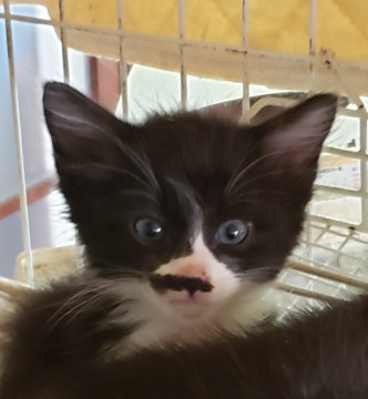 ふわふわの黒白君で、足にはソックスを履いています。特徴は、お顔の一文字、オンリーワンの模様です。