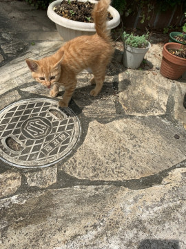 民家の軒先に数日前から現れるようになり、迷子猫かと思い近所に当たってみましたが飼い主は居らず母親らしき猫と一緒に居たのを見たことが有るとの話を聞きました。その後は母猫は姿が無く仔猫1匹で数日の雨の中震えていた為 保護しました。