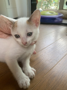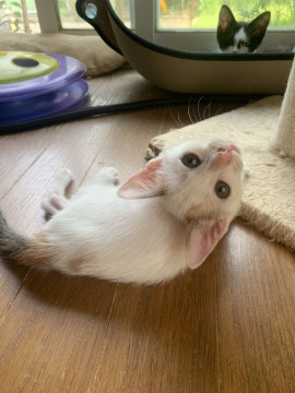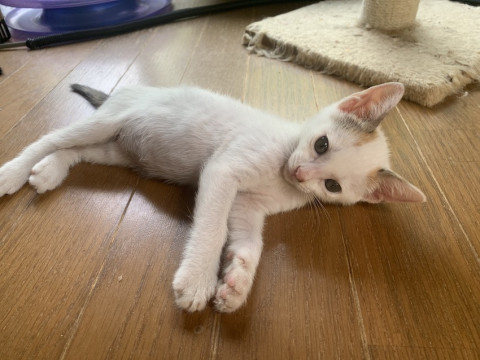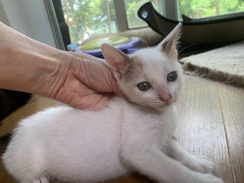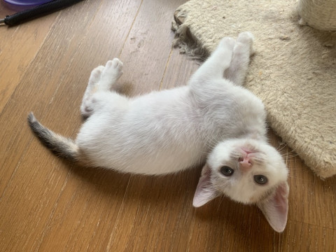 可愛い赤ちゃん白三毛、ちゅーちょちゃんです。ちょっと小柄ですが柄の出方とちょっと宇宙人っぽいところがとってもキュート。もっちりぷくぷくのお腹もたまりません。ミルクから育てているので大変人懐こいです。