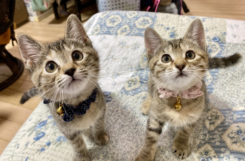 目が開く前から人の手で育てられたので、二匹とも誰にでも良く懐き、物怖じしない天真爛漫な子猫です。