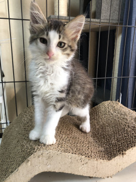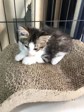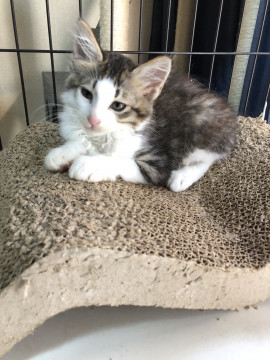半長毛でモフモフのとても可愛い男の子です。尻尾はかぎしっぽ、他の子猫たちと追いかけっこして遊ぶのが大好きです。