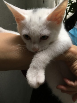 頭にグレー模様あります。白色な尾尻長いとっても可愛らしい男の子です。お目は、大きく金色です。 人好きで、抱っこも出来ます。