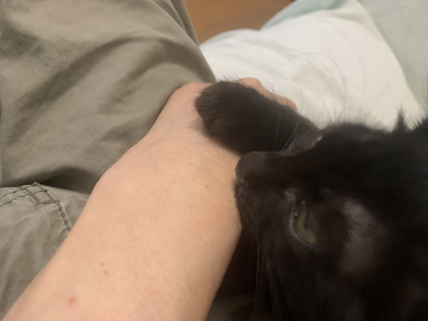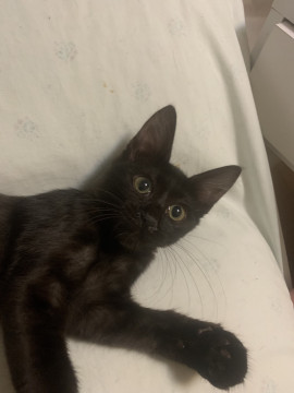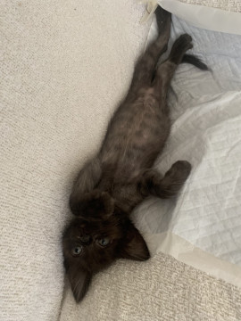 保護当時妊娠していた母猫が産みましたが、途中でミルクを飲めなくなったのでほぼ人工哺乳で育てました。そのせいか、人が大好きで、母猫がそばにいても目にくれず、人の腕などをチューチュー吸います。どこへ行くにもついてきてくれますし、もちろん抱っこもお膝も大好きのゴロスリ甘えん坊です。