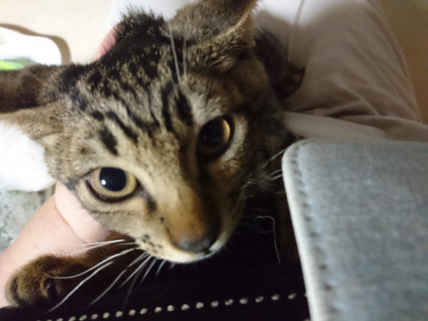 まだなついていません。シャーシャーいってます。でも首の後ろをもって抱っこもでき、そっとなでることもできます。かみついたり、ひっかいたりはしない、本来とても穏やかな子のようです。時間をかければなつくと思います。チュールをみせると寄ってきて手から食べてくれるようになりました。
