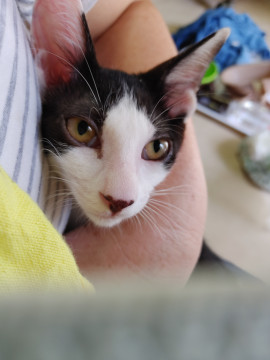 はじめ少しビビってましたがすぐに人馴れしました。抱っこするとゴロゴロいいます。スリスリよってきてとても可愛い子です。