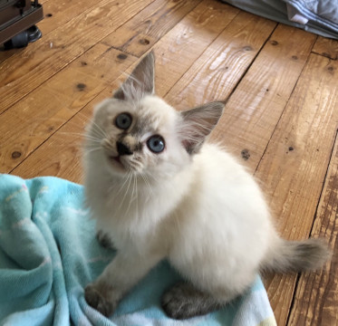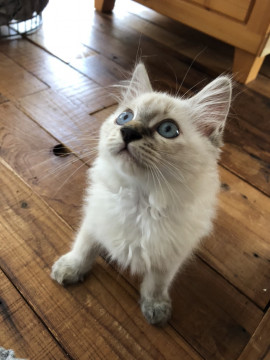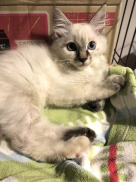まだ人馴れがじゅうぶんではありませんが、オモチャで遊んだり、膝に登ってきて遊ぶようになりました。触れます。