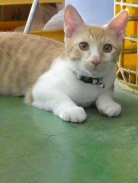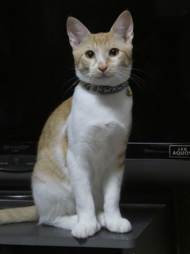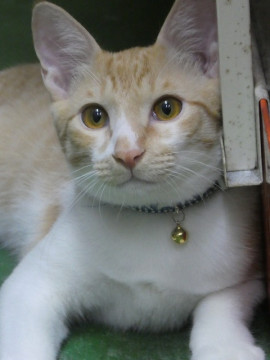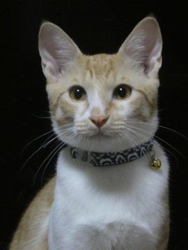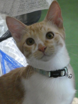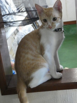 茶白でかわいい顔の男の子。シッポは長くてまっすぐ。 性格は大人しい子です。