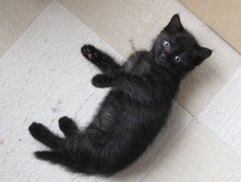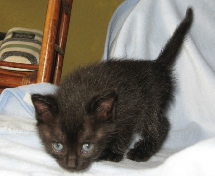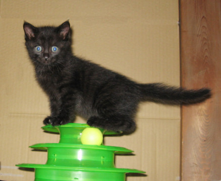 全身光沢感のある黒い色ですが光の加減で縞模様が見えることも。目の色がブルーですがいわゆる「キトンブルー」なのか、固有色なのかよくわかりません。尻尾は長く真っ直ぐです。黒猫は昔の日本では魔よけ厄除けの力を持つと言われているので家に幸福を運んでくれるラッキーな子ネコなのかも。毎日のように兄弟同士でじゃれたり追いかけっこしたり、オモチャで遊んだり元気いっぱいです。