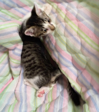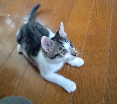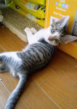 よく食べてよく遊びます。一人遊びもしますが、遊んでほしくて人やほかの子猫に全身で絡んできます。