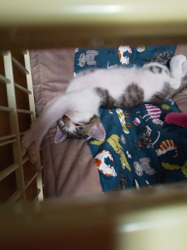 生後1ヶ月ちょっとで母猫からはぐれたのか、川に落ちてずぶ濡れで泣いているところを愛護センターに保護され、さくら猫の会が引き出しました