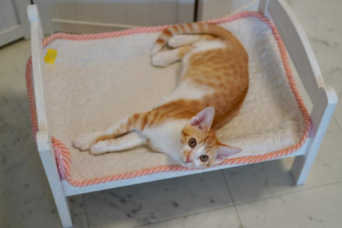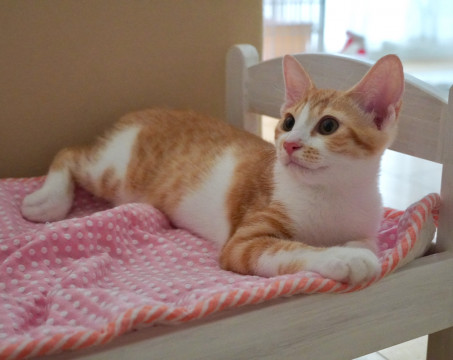 珍しい「スポッテッドタビー」(水玉のようなポイント模様の縞柄)のレッド&ホワイトの毛並み。
