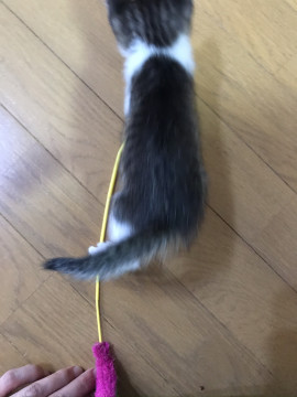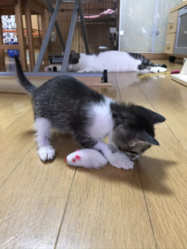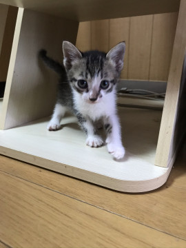 活発な女の子です。月齢は1ヶ月半くらいで、毛もふわふわして、歩くのもヨタヨタですが、何にでも興味津々です。保護した姉弟のうち、最初から物怖じせずご飯を食べたのは、このとらみちゃんです。遊ぶのが大好きみたいです。猫じゃらしを自らくわえて持って行ったり、ネズミのおもちゃで遊んでみたり、遊んだ後はハンモックですやすや寝てしまいます。尾っぽはまっすぐで、長めです。テレビボードの狭い隙間にも入ってしまうので、おうちで飼うときは、隙間にご注意下さい。