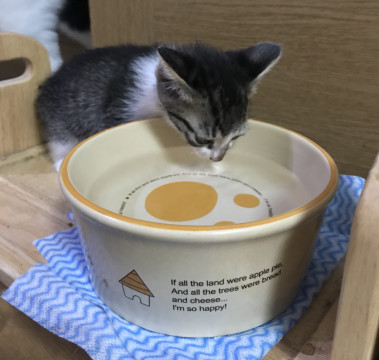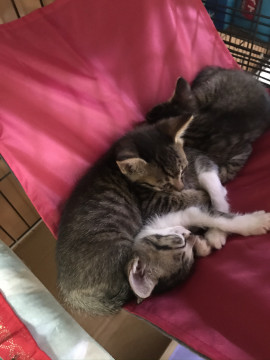 姉弟4匹、この暑い中、段ボールに入って河川敷に棄てられていました。当時は痩せていて、ノミも多かったので、保護して栄養を与え、当日シャンプーをしました。その後、動物病院に連れて行き、健康チェックと検査の為、2泊入院しました。今ではお腹ぷっくりさん、身体も綺麗になって気持ちよさそうです。
