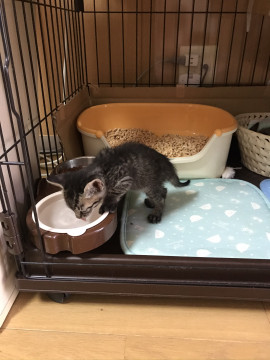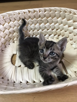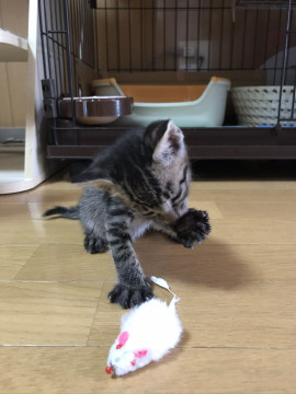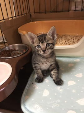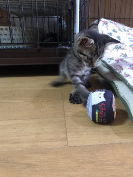 元気いっぱい!キジトラの男の子です。月齢は1ヶ月半くらいで、毛もふわふわして、歩くのもヨタヨタですが、部屋のあちこちを探検しています。静かだな~と思うとその場で寝てたりして、まだまだ赤ちゃん猫なんだなと思います。尾っぽはかぎ尻尾で長めです。テレビボードの狭い隙間にも入ってしまうので、おうちで飼うときは、隙間にご注意下さい。