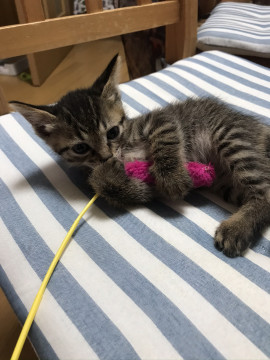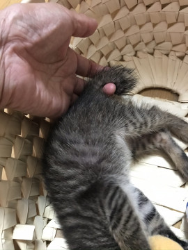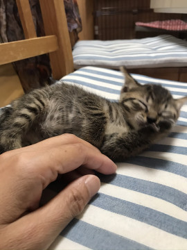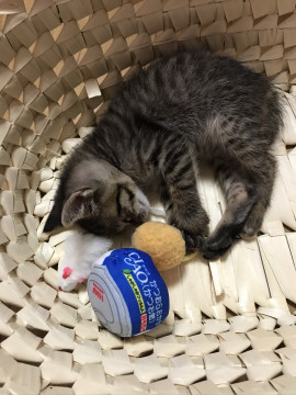 ちょっと控えめな女の子です。月齢は1ヶ月半くらいで、毛もふわふわして、歩くのもヨタヨタですが、おもちゃに抱きついたり、姉弟とじゃれ合ったり、子猫らしいしぐさをします。尾っぽはクルンと丸まったカギ尻尾で短めです。寝落ちしてしまう所がなんとも可愛いです。テレビボードの狭い隙間にも入ってしまうので、おうちで飼うときは、隙間にご注意下さい。