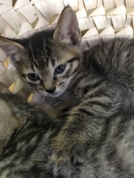 姉弟4匹、この暑い中、段ボールに入って河川敷に棄てられていました。当時は痩せていて、ノミも多かったので、保護して栄養を与え、当日シャンプーをしました。その後、動物病院に連れて行き、健康チェックと検査の為、2泊入院しました。今ではお腹ぷっくりさん、身体も綺麗になって気持ちよさそうです。