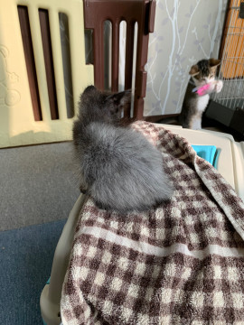必ず何かの上に座っている子。お膝の上に乗ったり、手の上に乗ったり・・・必ず乗って座っております。遊ぶのは大好きです。