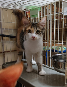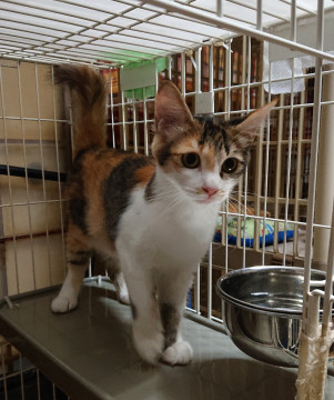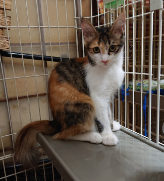 白ミケの女の子で、しっぽの毛がフサフサしています。