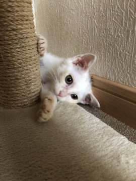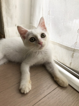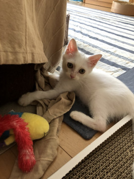 触られるのが大好きですぐ人の側まで来てお腹を出します。自分から膝に乗ってきたり抱っこも大好き♪ボールが好きで一人遊びも上手です。