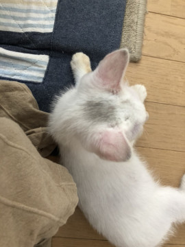 大福は猫風邪による結膜炎と鼻水がひどく、口腔内の消毒も必要な状態でしたが治療を頑張って美猫に成長中です。