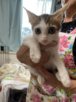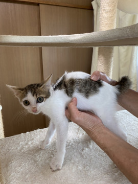 まん丸お目目でとっても可愛いキジ白ちゃんです。穏やかな猫で猫ちゃんも大好きですし、1匹でも一人遊びするので大丈夫です。