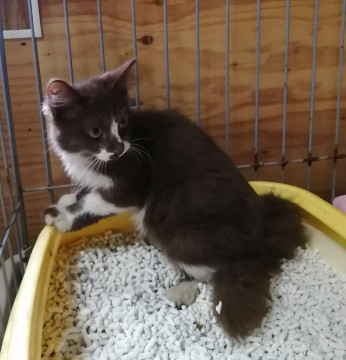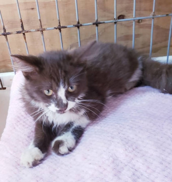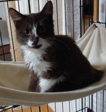 最初は、ケージに入れられてビックリ顔のブランちゃんでしたが、生まれてはじめて食べるチュールに おねだりまでするようになりました。毛色がダークブラウンで半長毛の洋猫さんのようで 個性的な可愛い子です。