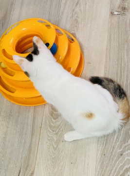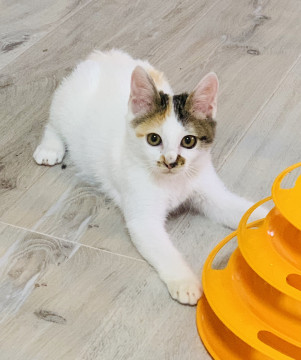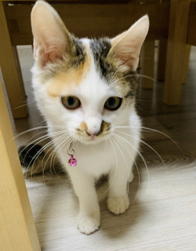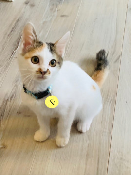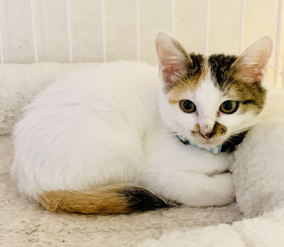 身体はほとんど真っ白、お顔と尻尾に色の入った、きれいな三毛猫です