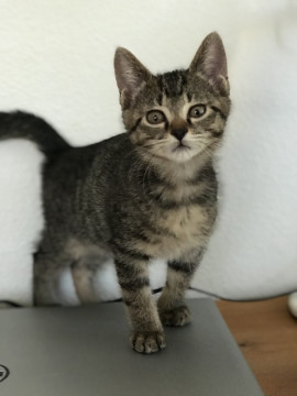 すごくキュートな顔をしたキジトラ柄の女の子です。しっぽはストレートロング。