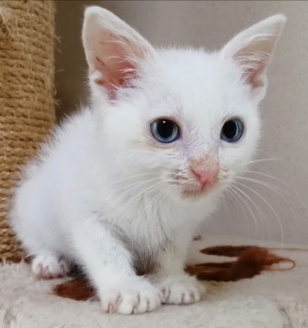 真っ白で目が青くしっぽは真っ直ぐです。