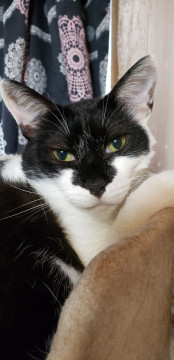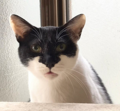 マスクをかぶったような黒白ぶち猫のポッポ。