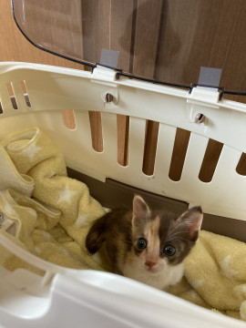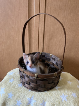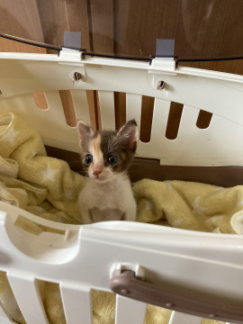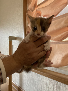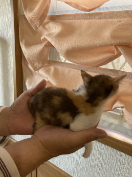 9月24日に住宅地の歩道にかたまっていたところを保護されました。体重が70gほどでまだへその緒が付いた状態だったそうです。元々6匹の赤ちゃん猫がおりましたが、当方ミルクボランティアをしており、そのうちの複数の三毛猫をお預かりしております