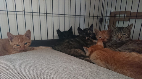 子猫が産まれているとの連絡があり見に行くと、大人猫たちと一緒に3匹の親が生んだ子猫が6匹いました。