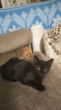 ウチに着て2日で先住猫と馴染みました。まったく物怖じせず他の猫にちょっかいばかり出しています。猫図鑑で調べたところたぶんボンベイの血が濃く流れているとみられます。艶々した黒い被毛やすらりとした筋肉質のボディ、ゴールドのパッチリした目等ボンベイそのものです。性格も人懐こく鳴き声も可愛いです。初めて猫を飼う方でも飼いやすい子だと思います。