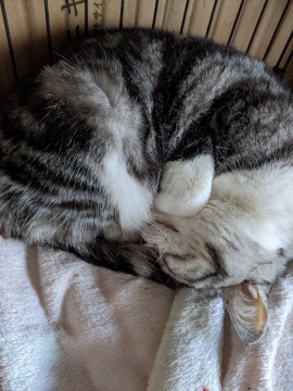 保護した時に身ごもっていて5匹の子供を産みました。その後避妊手術を致しました。とても甘えん坊でスリスリしてきます!年齢は推定です。