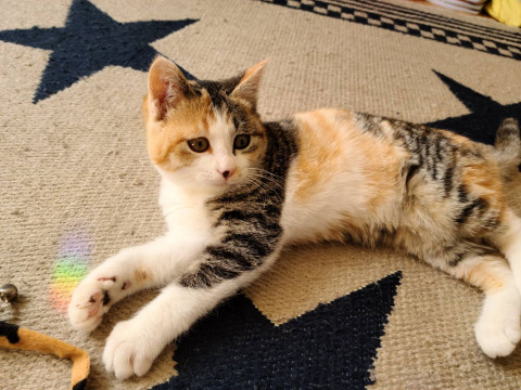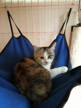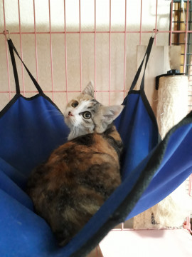 チュールと缶詰めに釣られて保護されました。すっかり甘えん坊さん、美少女です。