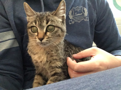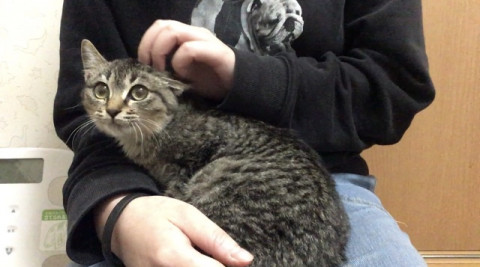 臆病な女の子です。手を伸ばすと隅に逃げますが、抱っこはあまり嫌がりません。しばらく撫でてあげるとごろごろとリラックスします。