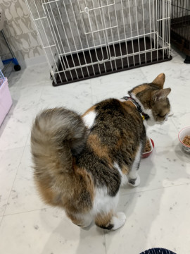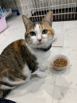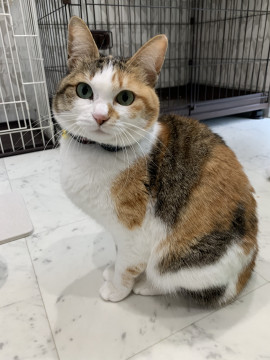 綺麗な三毛猫で、尻尾はフサフサでくるんとなってます。
