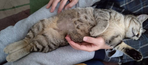 この仔猫は、保護場所に空きが無く生後5ケ月で避妊しリリースしておりましたので、耳先をカットしております。