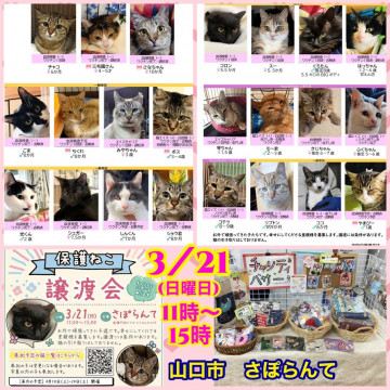 3月21日山口市のさぽらんてで開催される「保護ねこ譲渡会」に参加予定です。