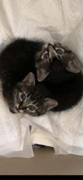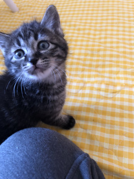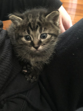 この仔猫はもう1匹より、手足にキジトラの柄があります。全体的には黒っぽいですが、お腹の方は少し白っぽいです。