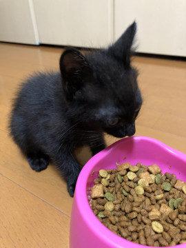 全身黒色ですが ちょこちょこ白い毛が伸びてきているのと、うっすら縞模様がでているので大きくなったら真っ黒ではないかもしれません。抱っこするとお腹をだしてグルグルいう甘えんぼです。とても元気なので ジャンプしてケージから飛び出して飛びついてきます( ¨̮ )︎ トイレは砂できちんとできています!
