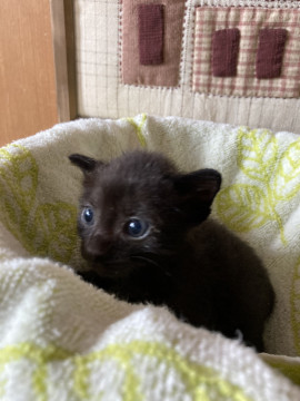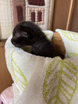 黒猫と黒にお腹が白い猫とキジシロ柄の三匹きょうだいのうちの黒猫です。