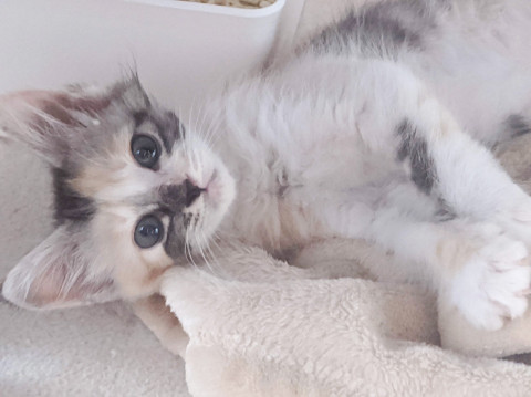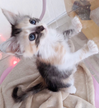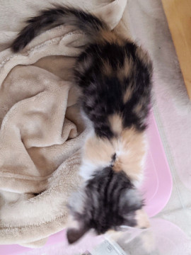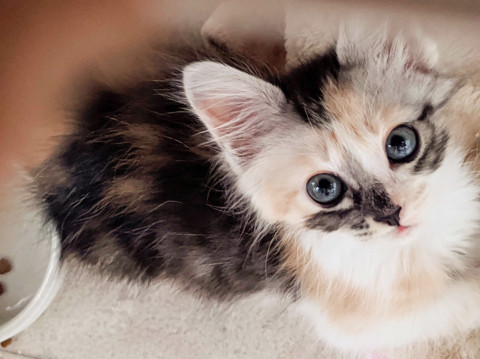 ふわふわの三毛ちゃんです。少し縞模様の部分もあります。