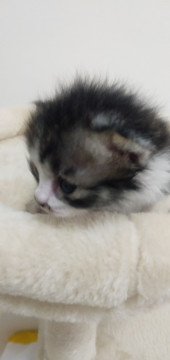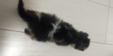 6/20頃生まれの黒白の背中にギザギザ模様が入った個性的な男の子です。仔犬のようなお顔をしています。