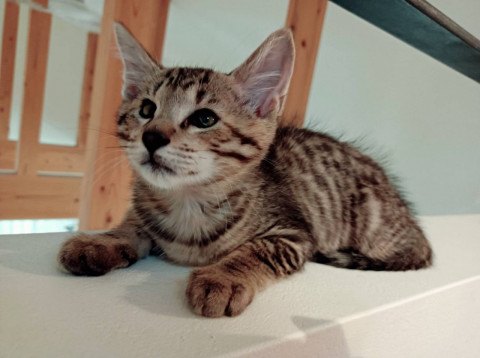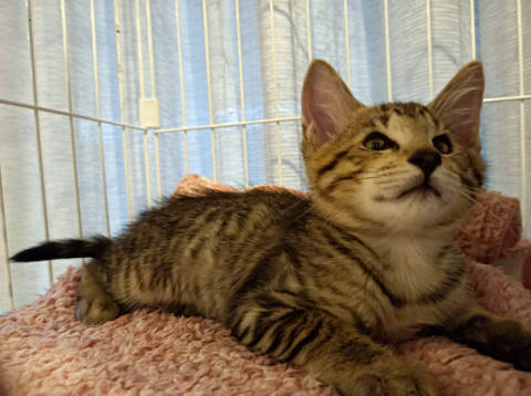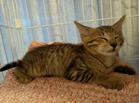 ちょこんとした顔立ちが特徴的な子です。保護時、脱水気味で小柄で兄弟猫に守られるようにくっついていました。おっとりとした性格で人に慣れるのも早かったです。