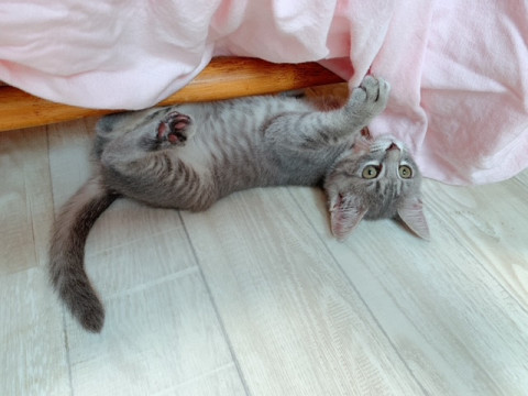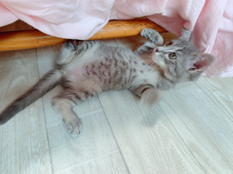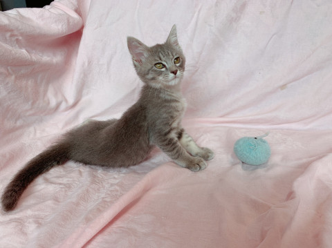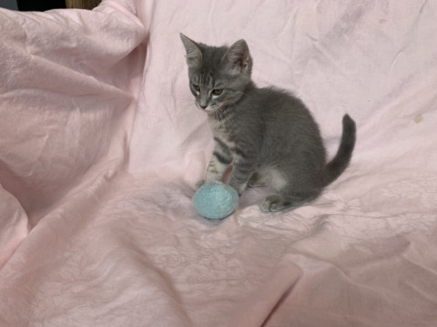 グレー色のようなキジ柄です。子猫らしく元気に遊んで寝て過ごしています。成猫とも友好的に過ごしています。