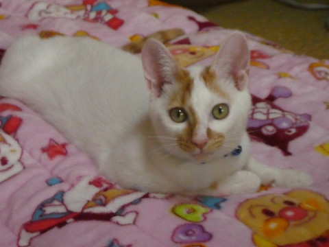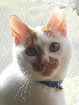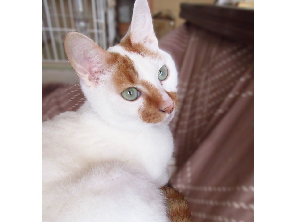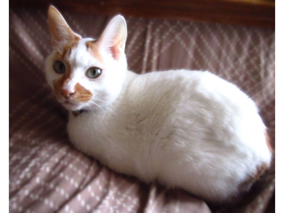白が多い茶白の子です。ごはんは少しずつちょこちょこ食べるタイプ。そのせいか我が家のオス猫のなかではスリム体型です。(他の猫が大きすぎるのもアリ…)