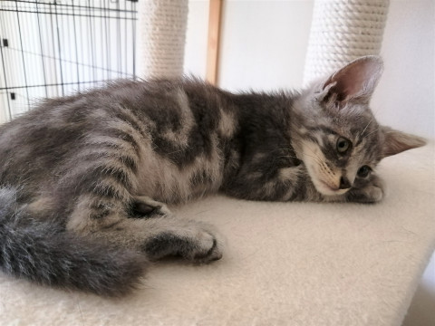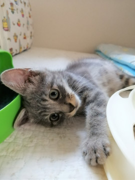 保護時はガリガリに痩せ、体はノミ・ダニに喰い潰され、お腹には回虫、コクジウム、風邪症状もありと、ひどい状態でした。医療と強制給餌を重ね、なんとか元気回復、もう大丈夫! 走り回るほど元気な男の子になりました。